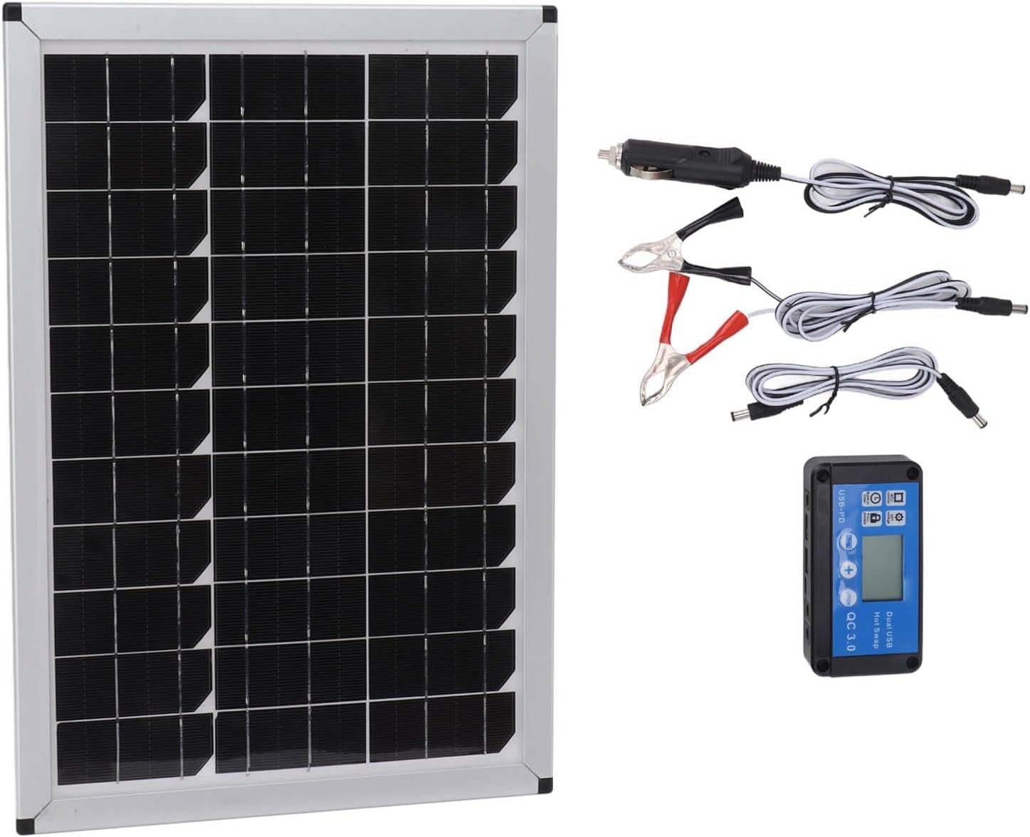 The 100W 18V Portable Solar Panel Kit, made from monocrystalline silicon and ABS, is a versatile and efficient power solution weighing approximately 724g. With size of 40×27.5cm, it features high conversion efficiency and stable output, suitable for charging automotive batteries, ships, airplanes, outdoor , and more. The solar panel recharger kit includes a solar panel, connection line, lighter, clip group, controller with multiple interfaces (Type C, USB, DC), and a manual. Easy to install and carry, this solar panel can recharge two devices simultaneously, making it ideal for outdoor and emergency use.