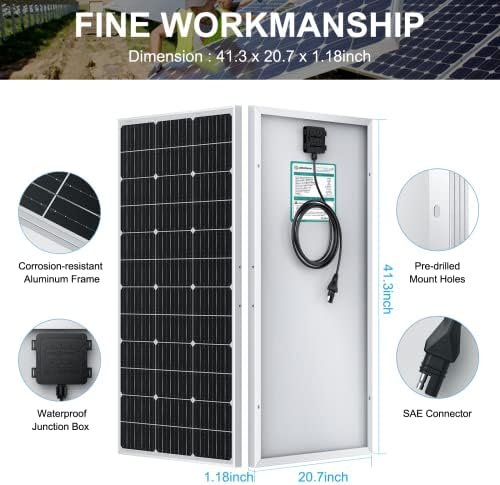??? READY TO USE ? The 100 watt 12 volt solar panel kit includes all the necessary solar kits for building a new system. The included 100 watt 12 volt monocrystalline solar panels, MPPT solar controller, alligator clip cable, O-Ring terminal cable allows to perfectly get start in solar. Great for off-grid application, using it to charge your RV, trailer, camper, marine, boat, van, truck, motorhome, cabin, caravan and more.
