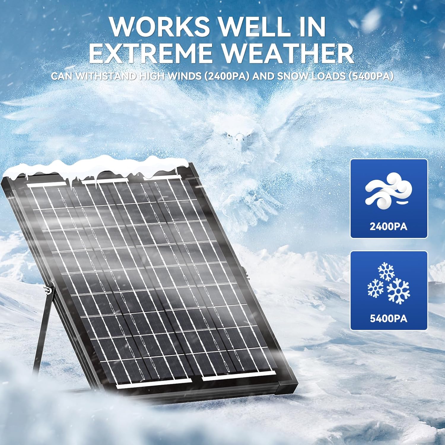 High Quality Material: The solar panel with a low-iron tempered glass surface and corrosion-resistant aluminum frame can withstand high winds (2400pa) and snow loads (5400pa), protected against weathering and wear, 100% waterproof and rustproof and will last for decades