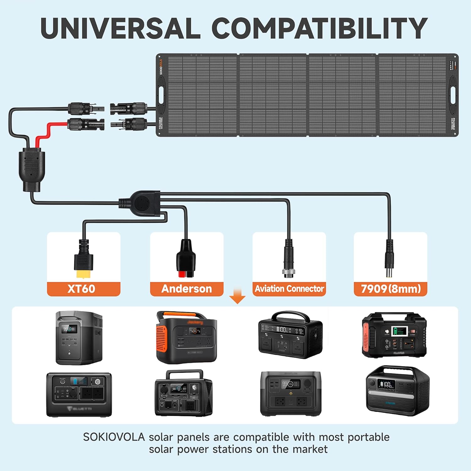 ?Compatible with Most Solar Generators?SOKIOVOLA 200W portable solar panel comes with MC-4 to 4-in-1 solar panel connectors (XT60, Aviation connectors,DC7909 (8mm),Anderson), which are compatible with most of the Solar generator/portable power station compatible (e.g. Jackery,Ecoflow, Blutti,FlashFish,Goal Zero,Anker,etc.)