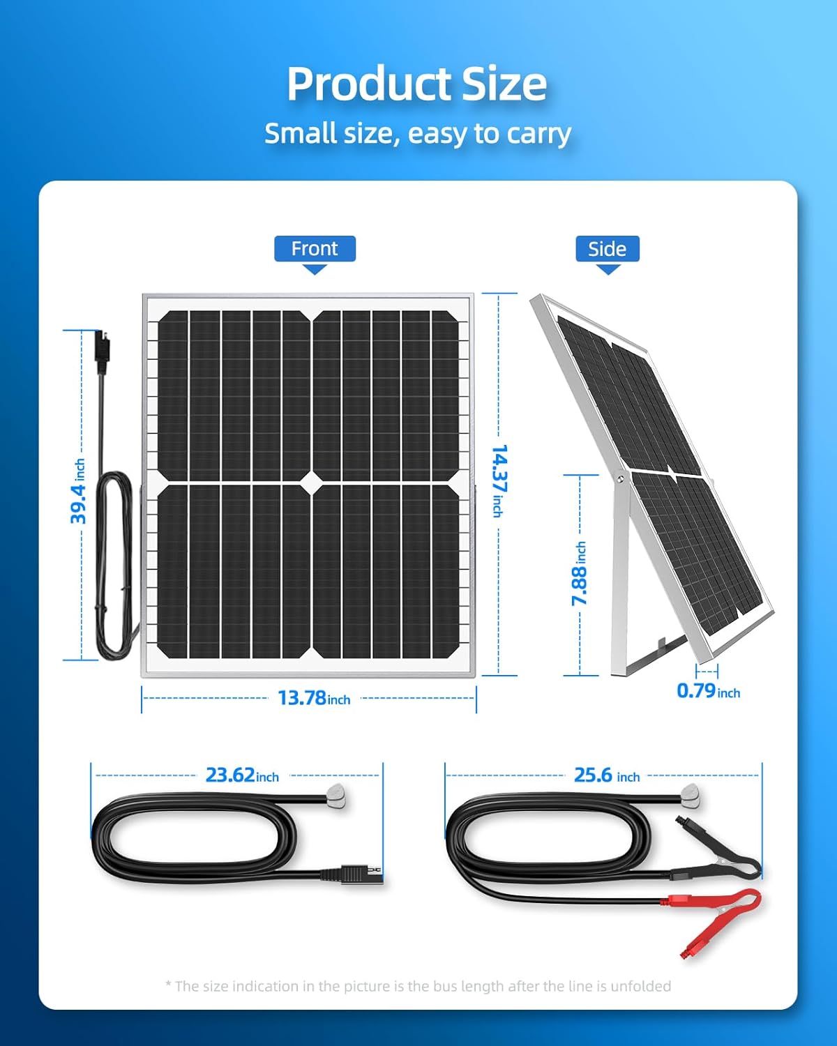 [What You Get and Installation] You will receive a 1pc 20W mono solar panel, 1pc 10A charge controller, 1pc 88cm(34.6ft) cables with alligator clips and 1pc 88cm (34.6ft) cables with O-ring terminal. The solar power kit is equipped with a mounting bracket. The back of the panel has pre-drilled holes for quick installation and fixing.