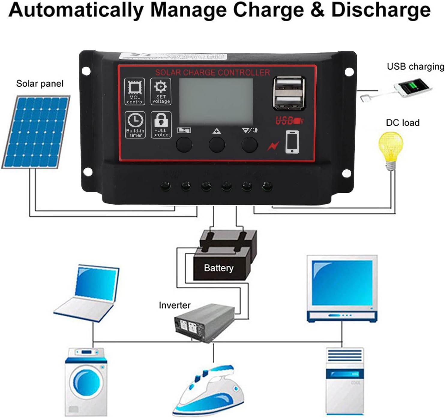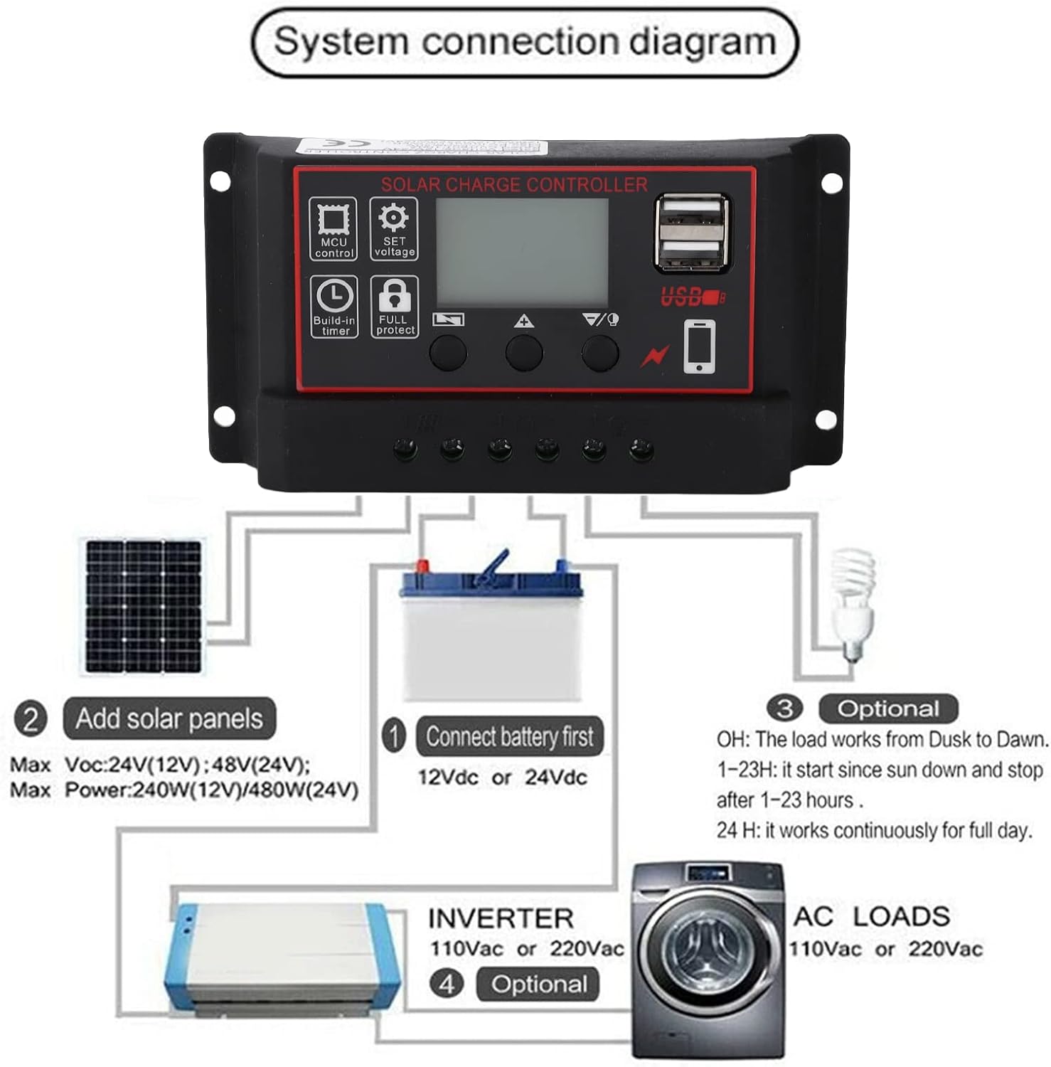 Controller Dual USB Output: Maximum current is up to 25A, supporting mobile phone charging. Dual MOS anti backflow circuit, ultra low heat generation, the charge controller will heat up during operation, please pay attention to install the charge controller in a flat, well ventilated place.