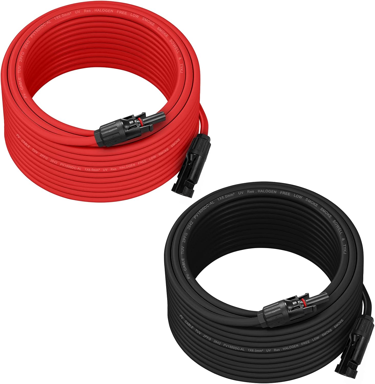 ?Upgraded Length—A pair of 20 feet 10AWG solar extension cables (one black + one red), and both solar cables are terminated with cable connectors.