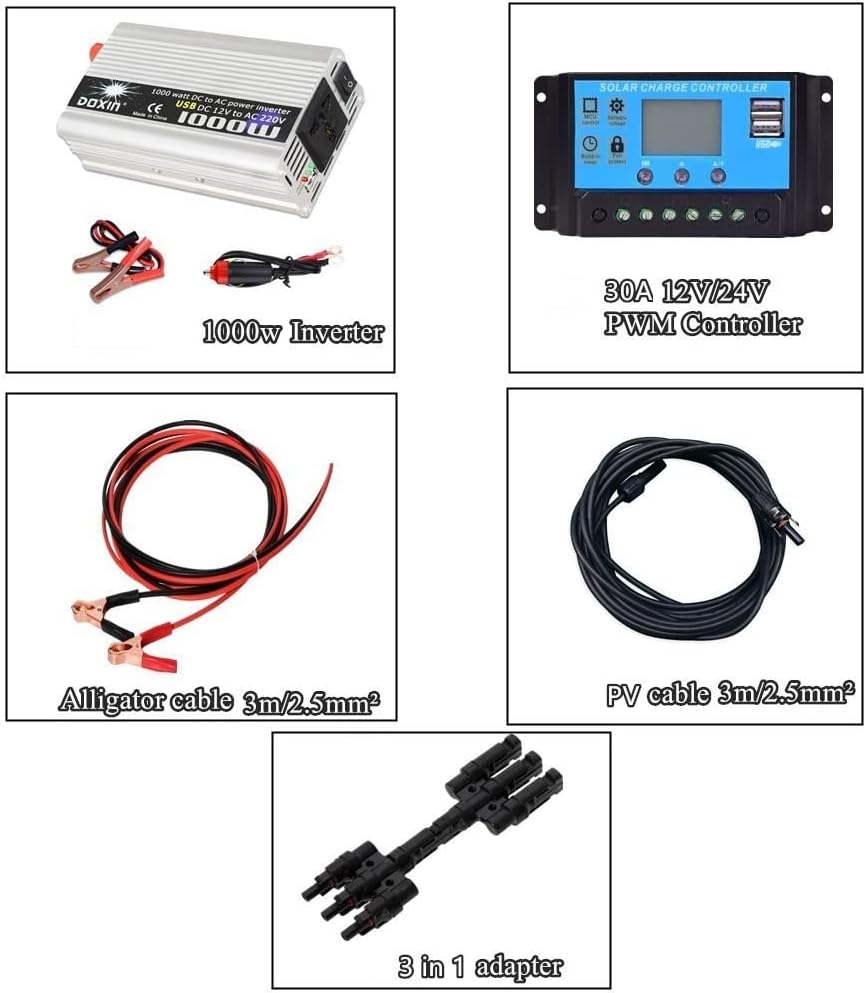 [Installation Ready]The kit includes 3pcs 100W monocrystalline solar panel, 30A controller, 1000W inverter, MC4 cable, alligator clip cable, 3 into 1 adapter. The dimension of solar panel is 1050*540*3mm.