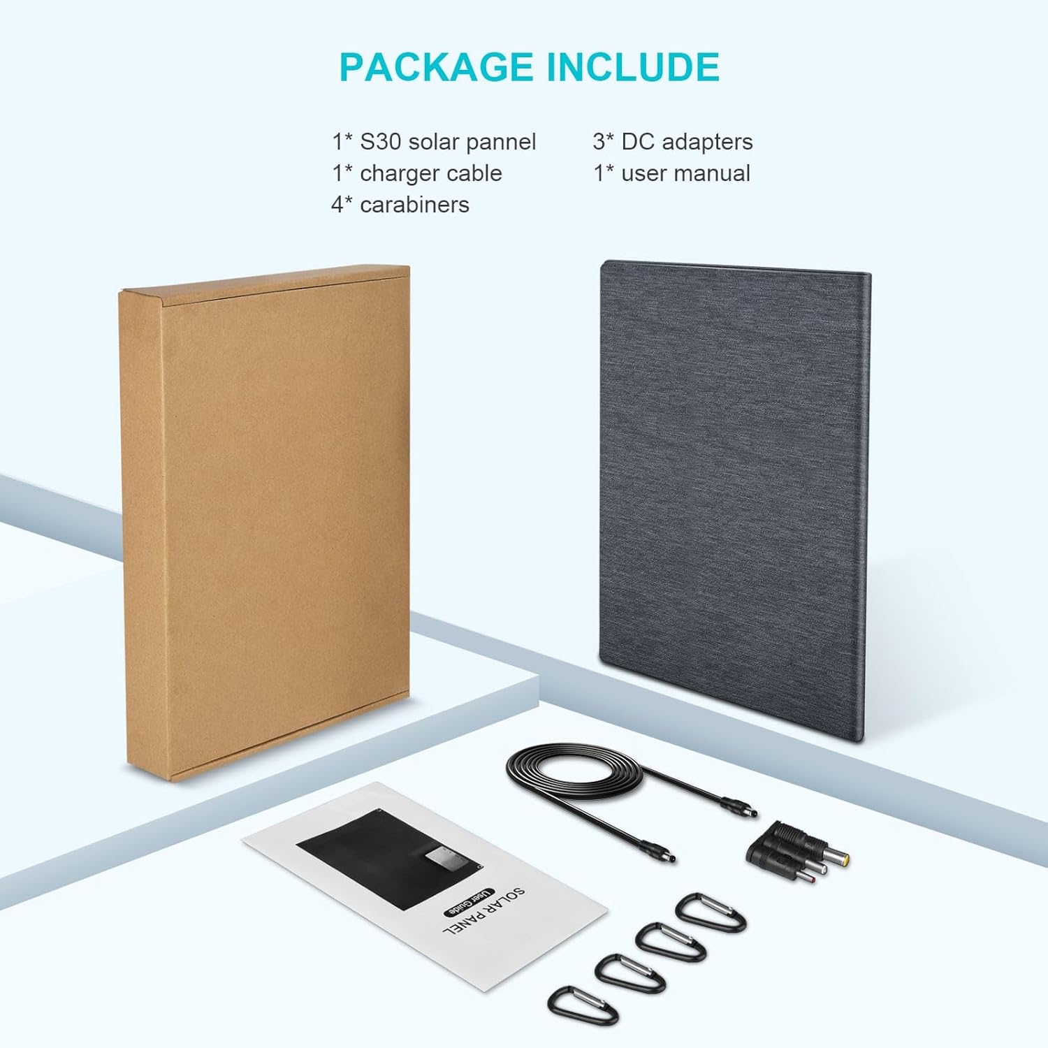 Package List:1* S30 solar pannel,1* charger cable,4*carabiners, 3* DC adapters,1* user manual. If there’s any problem about the product please contact us and we will reply to you in 48 hours.