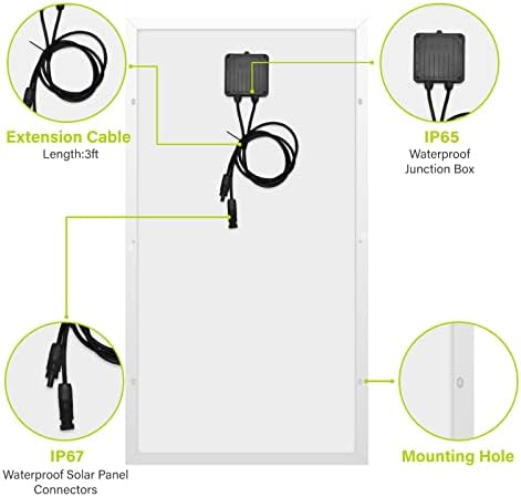 Easy Installation: This solar panel comes pre-drilled for easy installation. Diodes are pre-installed within the junction box, alongside a pair of pre-attached 3ft solar connectors cables, making installing the panel a hassle-free experience.