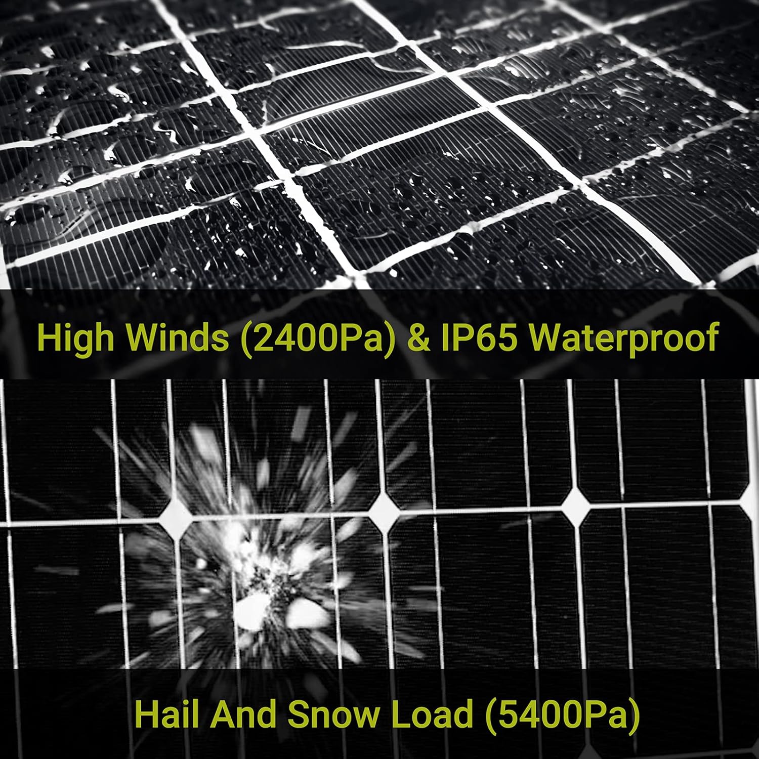 Rugged design to withstand high winds (2400Pa), hail, and snow load (5400Pa)The heavy-duty anodized frame provides strong protection for the panel structureThe panel and junction box are protected from common weather conditions and water splash (IP65 rating)