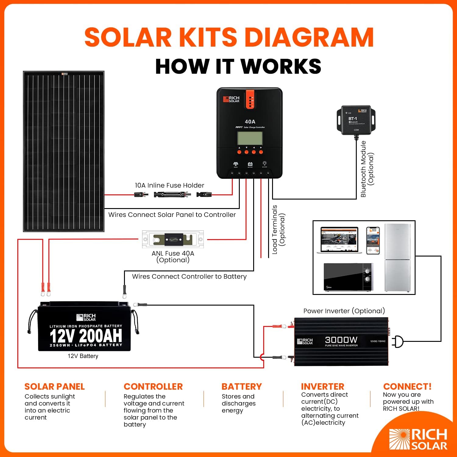 ?Industry Standard?Size: 40.2” x 20.1” x 1.2”, 3′ cable with connectors, generate 5.15 amp power, charge 12 volt battery. Industry standard, quick connect cables, work in series or in parallel.