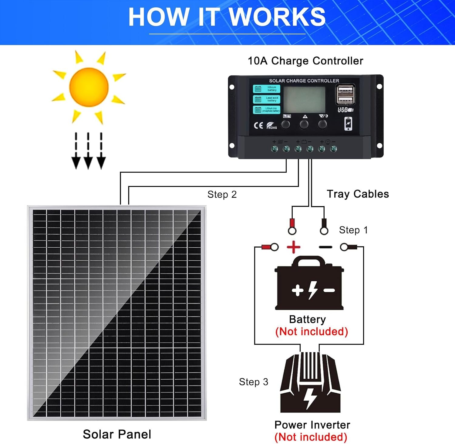 ?10A Charge Controller?Using PWM technology to protect your battery and extend its life. Intelligent protection against reverse polarity, overcharging, short-circuit, and reverse current. 2 USB 5V/2A output ports support mobile phones, tablet PCs, or other devices requiring 5V voltage