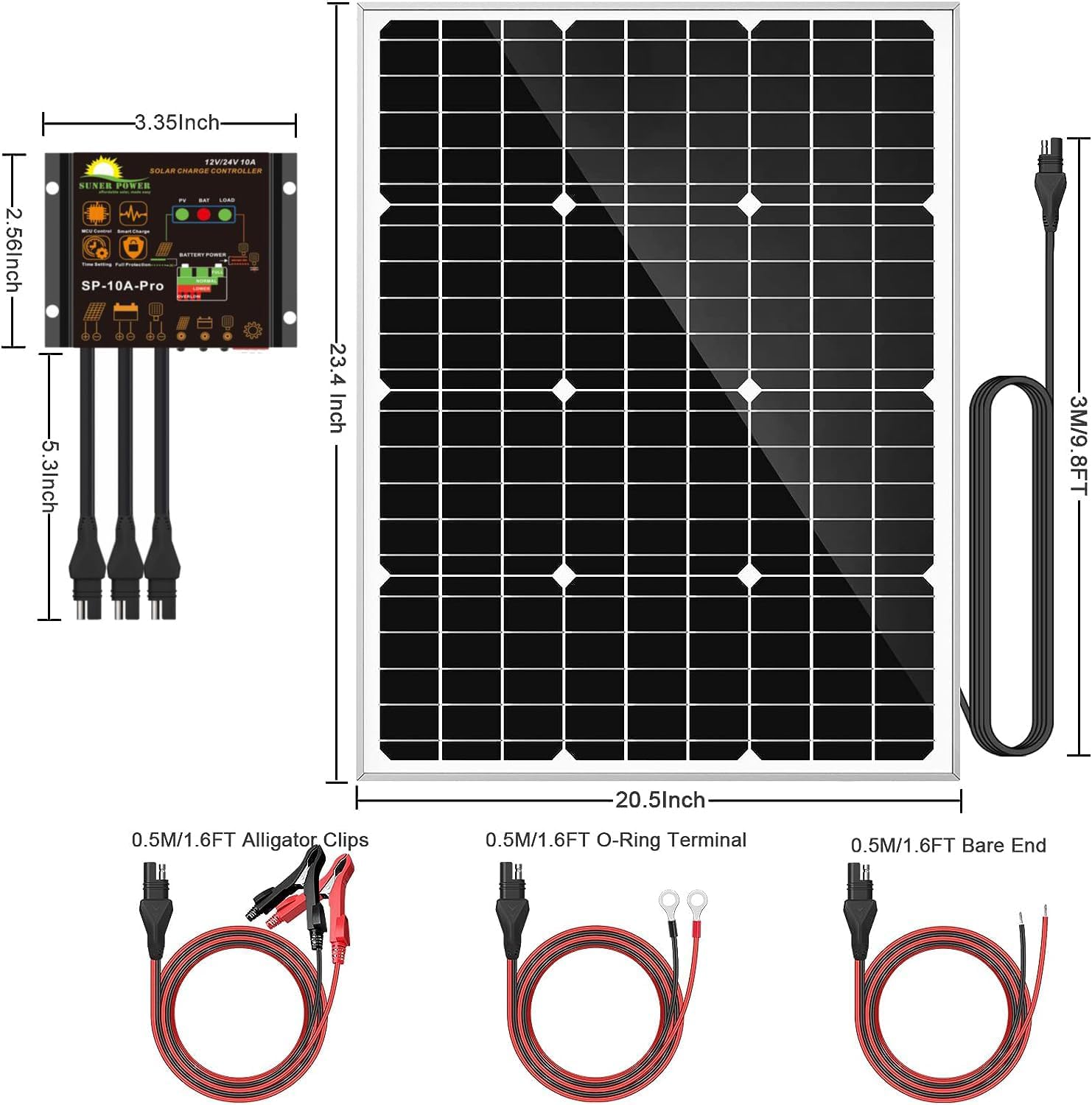 The kit includes: 1-Piece 50-Watt mono crystalline solar panel, an IP65 waterproof intelligent charge controller and 3-piece SAE cable kits- battery clamps, battery rings and bare wire cable, and manual.