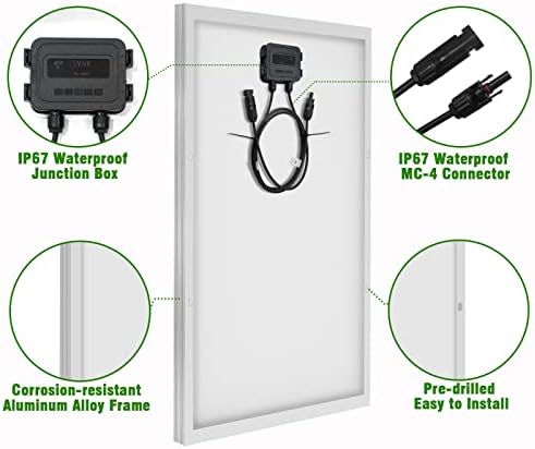 [Built to Last] Corrosion-resistant aluminum frame provides extended outdoor use that ensures the panel can last for decades. Both the IP67 junction box and IP67 MC-4 connectors have excellent waterproof function.