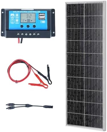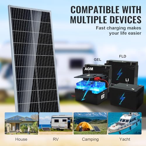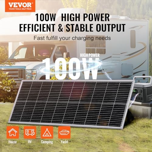 Enhance your lifestyle with VEVOR 100W powerful monocrystalline solar panel + charge controller. Boasting monocrystalline solar cells and 23% high conversion rate, it powers your devices from home, RV, and yacht to energize your camping, compatible with AGM, GEL, FLD, and LI various batteries.
