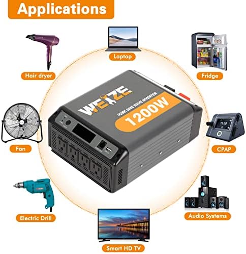 1200W Pure Sine Wave Power Inverter?Provides 1200W continuous DC to AC power. Converts DC 12V power to AC 120V power. It features 1 5V 2.4A USB port, 4 AC outlets for multiple devices charging, and remote control function.